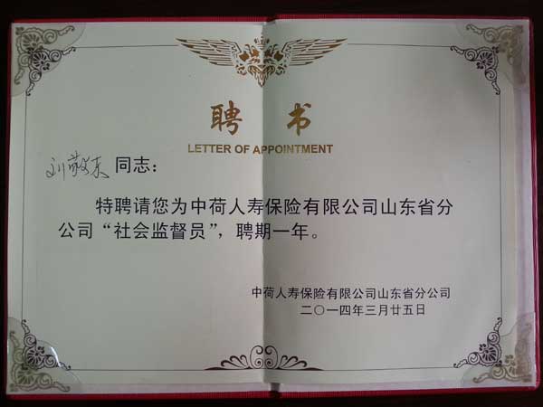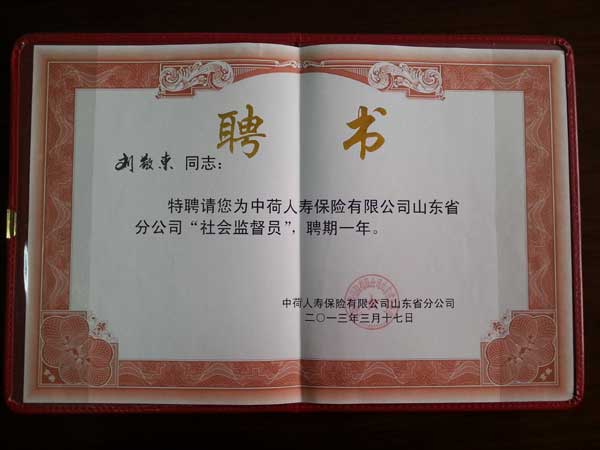 四方華邦保險(xiǎn)代理公司總經(jīng)理劉敬東本次又被聘任為中荷山東分公司的社會(huì)監(jiān)督員。