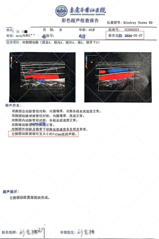 東莞某女士,45歲,2023年5月5日體檢彩超結果顯示,左側頸動脈分叉處后壁見約11.6mmx1.7mm扁平、附壁低回聲;右側鎖骨下動脈開口處后壁見約8.0mmx2.2mm扁平、附壁低回聲斑。左側頸總動脈分叉處斑塊形成,右側鎖骨下動脈斑塊形成。