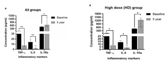 在此后5年的隨訪期間內(nèi),對(duì)11名健康志愿者的促炎及抗炎細(xì)胞因子進(jìn)行測(cè)量,結(jié)果表明:促炎細(xì)胞因子TNF-α和IL-6顯著降低,而抗炎性IL-1 Ra從基線至5年顯著增加。