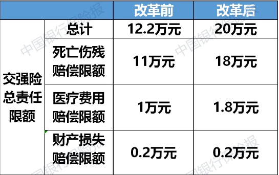 將交強險總責任限額從12.2萬元提高到20萬元,其中死亡傷殘賠償限額從11萬元提高到18萬元,醫(yī)療費用賠償限額從1萬元提高到1.8萬元,財產(chǎn)損失賠償限額維持0.2萬元不變。