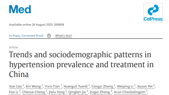 近日,國內(nèi)一研究團(tuán)隊在國際知名醫(yī)學(xué)期刊《Med》發(fā)表了題為《Trends and sociode-mographic patterns in hypertension prevalence and treatment in China》的研究報告。這項基于全國代表性大規(guī)模調(diào)查的研究,通過對比 2012-2015 年和 2021-2022 年兩個時間段的數(shù)據(jù),系統(tǒng)分析了中國成人高血壓的最新流行現(xiàn)狀與管理情況,為制定針對性的高血壓干預(yù)措施提供了重要科學(xué)依據(jù)。